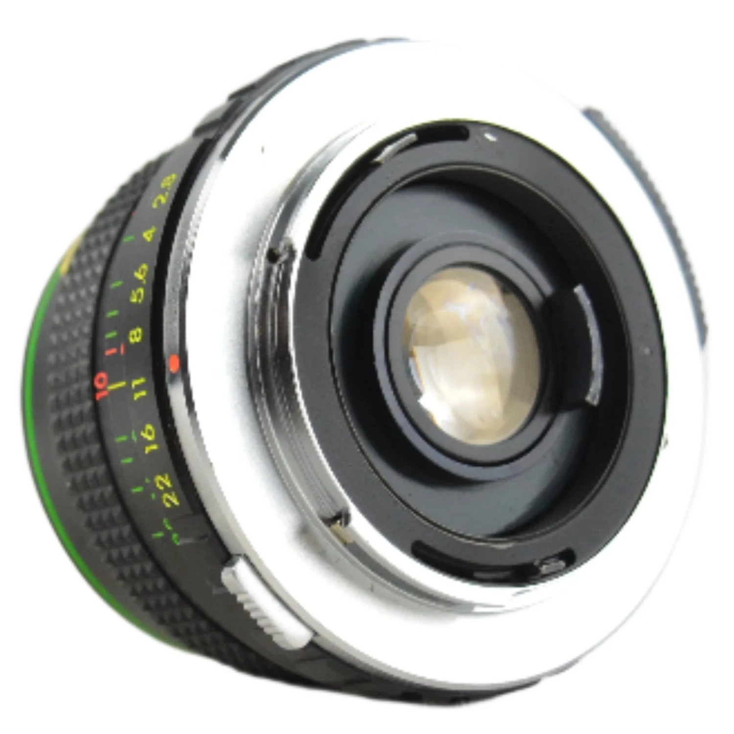 The lens elements are clear with just a few minor dust specs (no haze or fungus). The focusing operation works smoothly, plus all the apertures are selectable. This lens will fit on a Pentax with an Pentax Bayonet mount it also works with PK mounts.