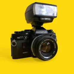 This external flash unit will work with Olympus XA Range film cameras. It is worth checking your user manual on how to use the flash, but the standard way is to pop it on the hot shoe attachment, wait for it to charge (you’ll hear a little whine whilst its powering up), set your camera to flash mode and when you shoot, the flash flashes!