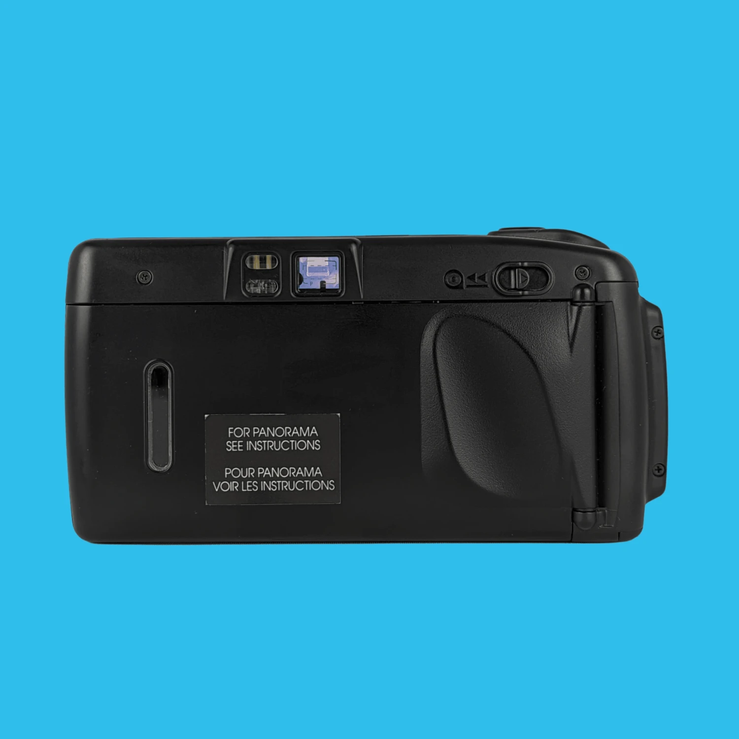 The Olympus Trip Panorama was a fully-automatic 35mm compact camera, with motor drive and fixed focus manufactured by Olympus. It was one of a series of cheap fixed focus models branded Olympus Trip and served as an update to the Olympus Trip Junior in 1991. Switching between panorama and standard modes caused a mask to pop up in front of the film chamber. A “P” mark appeared in the viewfinder during shooting to inform the photographer that panorama mode had been selected. The setting could only be chosen prior to film being loaded.