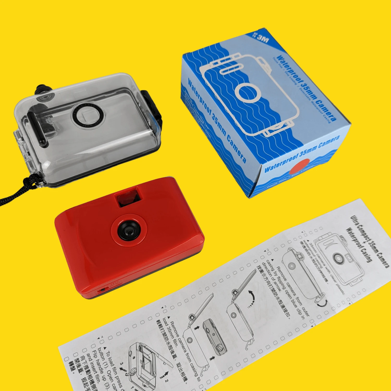 Here we have for you a simple to use, compact and lightweight reusable 35mm focus-free camera. It features a wrist strap and transparent waterproof case, meaning this camera can be used as normal and underwater!Â